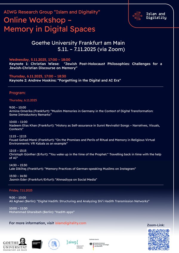 Ausgerichtet wird der Workshop Memory in Digital Spaces von der Forschungsgruppe "Islam und Digitalität" (Akademie für Islam in Wissenschaft und Gesellschaft [AIWG]). Ziel ist es, Studierenden einen Einblick in aktuelle Forschungsprozesse an der Schnittstelle von Religion und Erinnerung zu geben.